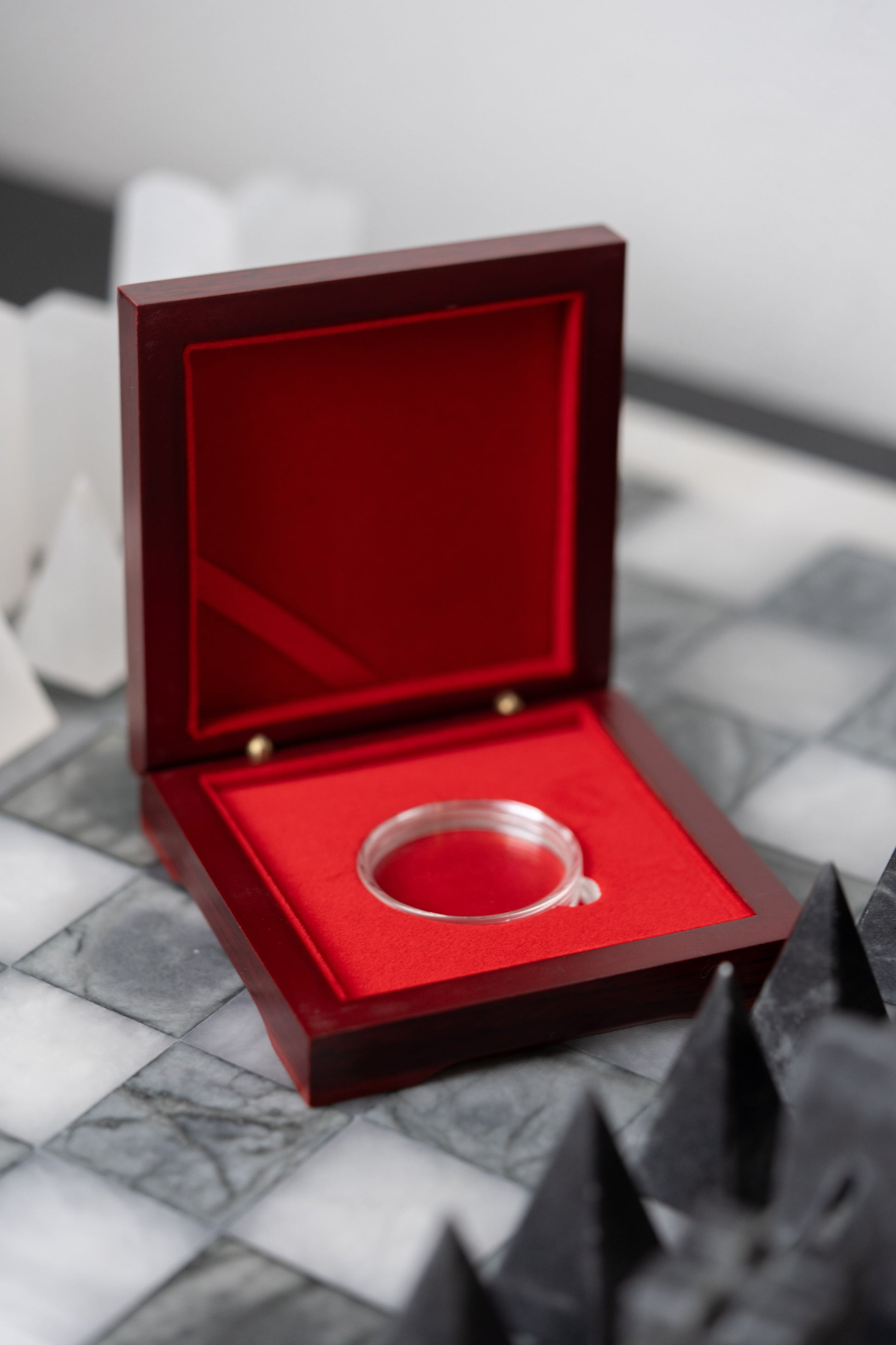 - 𝗘𝘅𝗾𝘂𝗶𝘀𝗶𝘁𝗲 𝗖𝗿𝗮𝗳𝘁𝘀𝗺𝗮𝗻𝘀𝗵𝗶𝗽: Meticulously crafted with a rosewood finish, plush red velvet padding, sturdy brass hinges, and a magnetic closure, this display case creates a breath-taking showcase for your precious coins.
